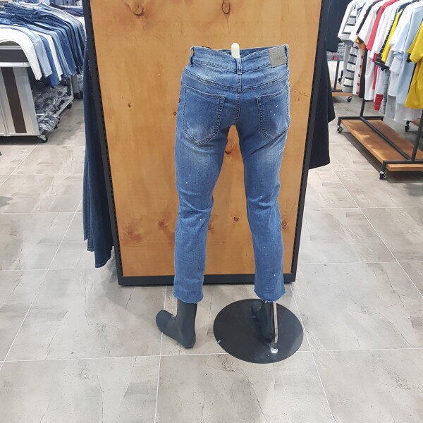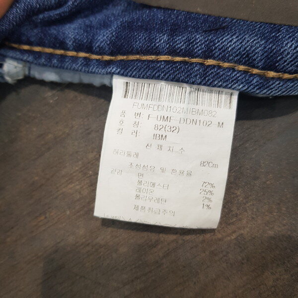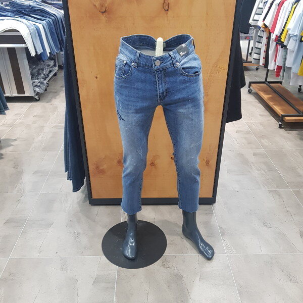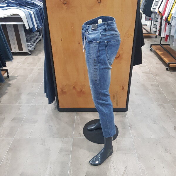 크롭 뉴슬림의 M톤 데님. 몸판에 초인트 레터링 자수와 와끼쪽 발염 패널 디테일이 들어간 희소성있는 디자인