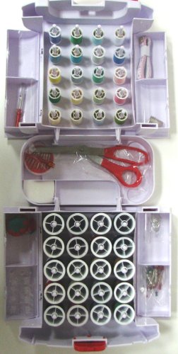 -. Feature : Great sewing system for travel and storage / Includes storage case, thread, pearl head pins, seam ripper, needle threaders, plastic bobbins, pin cushion, needle compact with hand needles / Features 8 storage compartments and 2 outside pockets for patterns and books / Imported item / Additional tools include a pin cushion, 10 bobbins, vinyl tape measure, scissors, and 3 thimbles