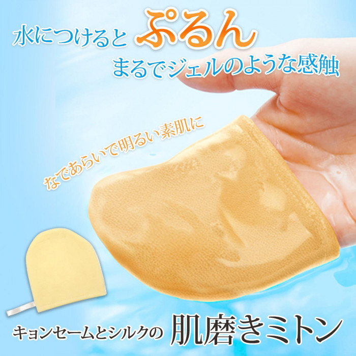 超極細のコラーゲン繊維(1/15万mm)のキョンセームは、水につけるとまるでフカヒレのようにプルプルに。軽くお肌を滑らせるだけで不要な角質を絡め落とします。素材・材質/鹿革、シルク 製造国/日本 ※サプライヤー直送品 ご注文後、当日~1営業日後の出荷となります【商品名】キョンとシルク肌磨きミトン