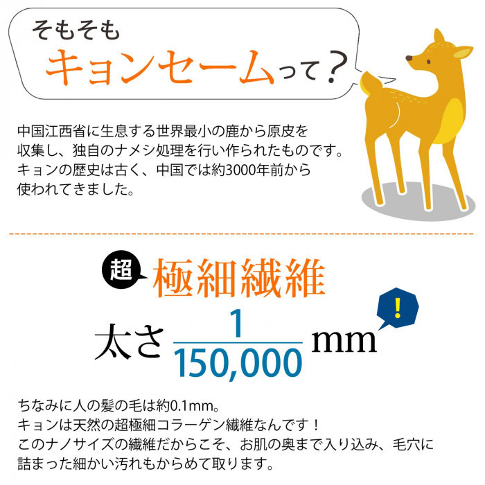 超極細のコラーゲン繊維(1/15万mm)のキョンセームは、水につけるとまるでフカヒレのようにプルプルに。軽くお肌を滑らせるだけで不要な角質を絡め落とします。洗顔ミトン/角質除去/毛穴汚れ/黒ずみ/天然コラーゲン/セーム/鹿革/鹿皮/ファイバー/肌荒れ/くすみ/毛穴