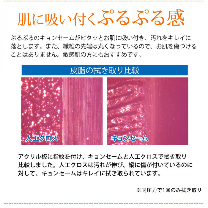 超極細のコラーゲン繊維(1/15万mm)のキョンセームは、水につけるとまるでフカヒレのようにプルプルに。軽くお肌を滑らせるだけで不要な角質を絡め落とします。