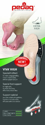 ReleaseDate : 2011-06-21 Studio : Pedag Publisher : Pedag Binding : Health and Beauty Product Description Viva High is identical to Pedag Viva except that the longitudinal arch is higher than average. 20-25% of people have pronounced longitudinal arches (hollow feet). Abnormally high arches are more common than low arches and can lead to more foot problems too. Viva High prevents fatigue and minimizes pressure points. Helps prevent and relieve Plantar Fasciitis. People with high arches often put excess pressure on their forefeet. Viva High has a metatarsal pad which reduces forefoot pressure which helps prevent and relieve Metatarsalgia, Morton’s Neuroma, etc. A heel cushion helps absorb shock when active. Finally, Viva High is made of the finest, durable, vegetable tanned leather and uses latex free, active carbon to neutralize odor. Viva High is thin enough to fit in almost and shoe or boot. High quality natural materials allow the foot to breathe and keep your shoes fresh. After wearing remove from shoes and air overnight. 0