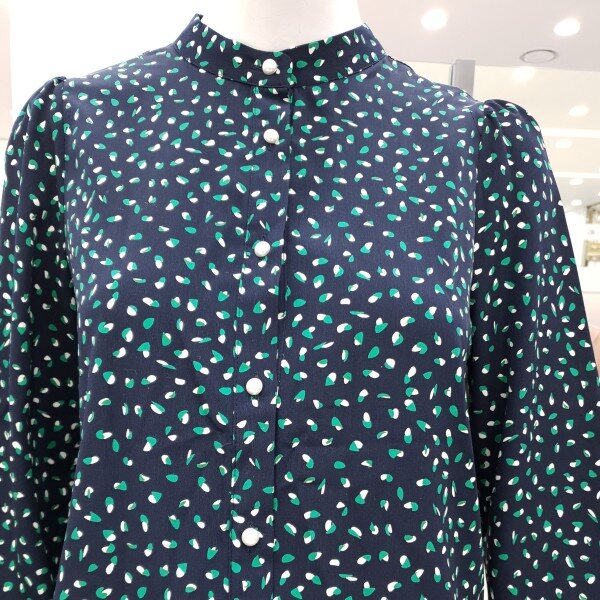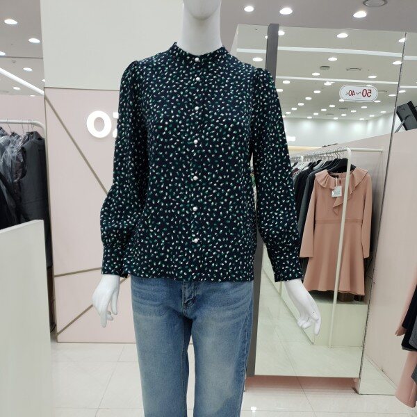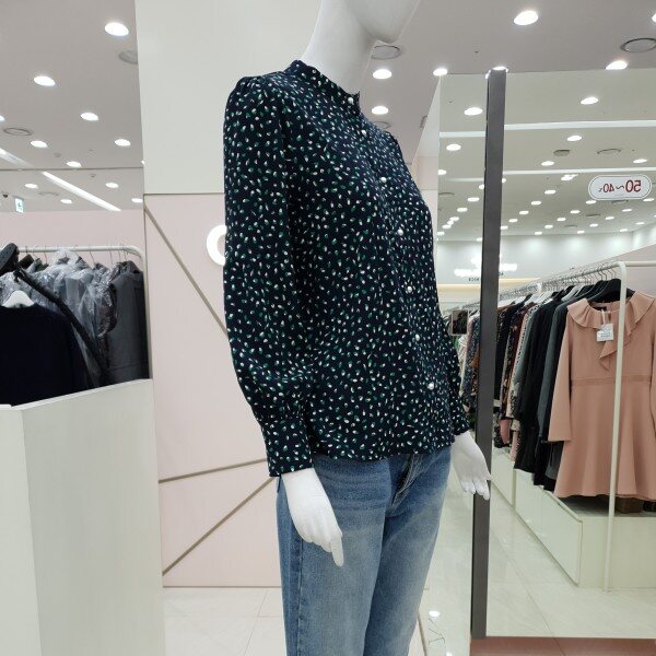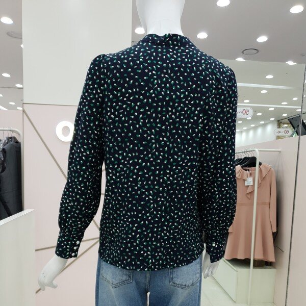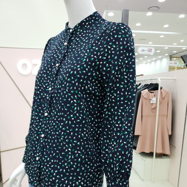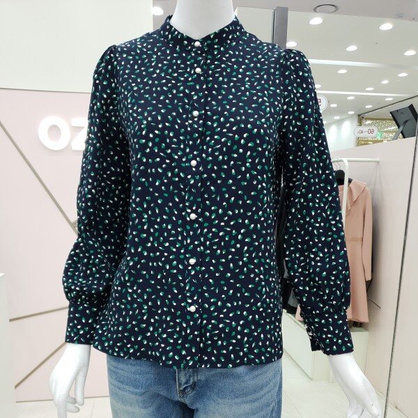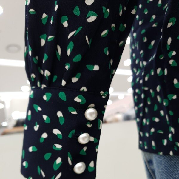 예쁜 프린트가 돋보이는블라우스예요진주단추가 여성스럽고어깨와 소매부분에 셔링이 잡혀있어요