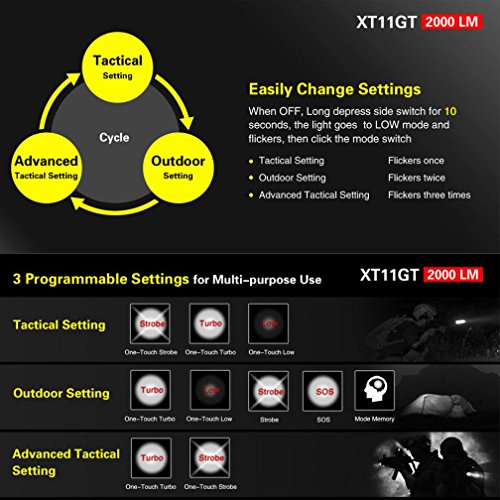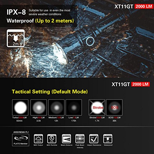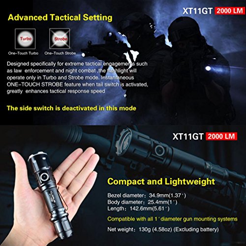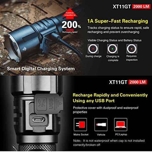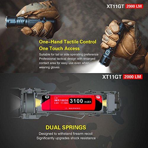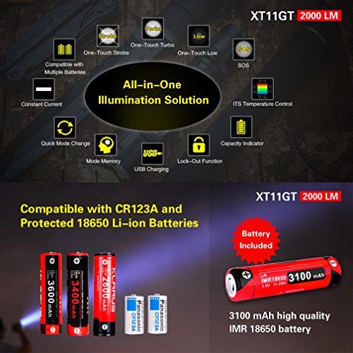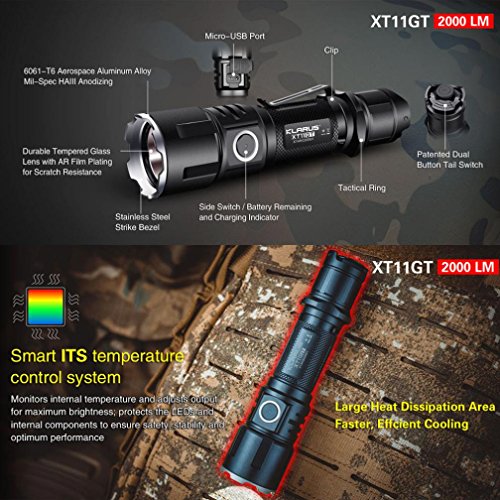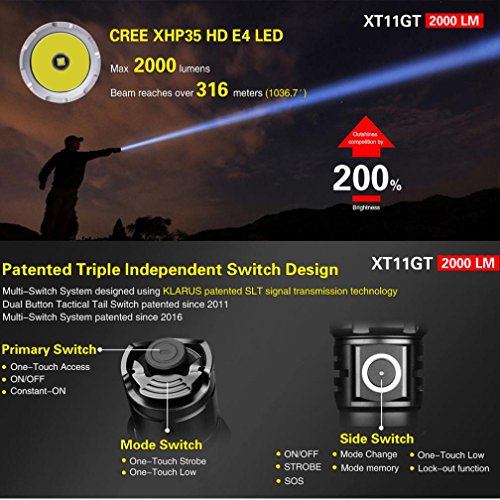 Studio : GTIA Publisher : GTIA Product Description KLARUS XT11GT 2000 Lumen Tactical Flashlight USB Charging LED Light Lantern Features: 4th Generation KLARUS Tactical Flashlight. Compact design; superb functionality; industry leading patented features Newest XHP35 HD E4 LED, 2000 Lumen Max Turbo output,; beam reaches over 316 meters Compatible with CR123A and protected 18650 Li-ion batteries, one 3100 mAh high-quality 18650 battery included Patented Triple-Switch control design, Easy to use; accommodates any user patterns Easy Interface: One-Touch Strobe; One-Touch Turbo; One-Touch Low; Mode memory; SOS; Patented Dual Tactical Tail Switch Control; One-hand tactile control; the next evolution in flashlight control UI Multiple levels with memory; SOS function; suitable for all needs in Hiking, Camping or Search and Rescue Special Lock-out mode. Prevents accidental activation to prolong battery use and avoids damages to eyes Capacity Indicator alerts on remaining battery capacity any time Reverse Polarity Protection; eliminates damage from incorrect battery install Monolith bezel design for efficient heat dissipation Hardened Mineral Glass lens with AR coating; scratch resistant Specifications: Utilizes XPH35 HD E4 LED with a lifespan of up to 50,000 hours Classic Tactical Setting as factory default Notice: Only when using KLARUS 18GT-IMR31 3100mAh battery or the same batteries of the other brand, the Max output could be up to 2000LM; When using the normal 18650 battery with PCB protection or 2 x CR123A batteries, the Max output couldbe only up to 1300LM Working voltage: 2.5V-8.4V Compatible Batteries: 1x 18650 battery with PCB protection or 2 x CR123A batteries Charging time: Depends on the battery capacity Switch type: Dual Tactical Tail Switch and Side Switch Dimension: (Head)34.9mm(1.37")×(Body)25.4mm(1")×(Length)142.6mm(5.59") Net weight: 130 g(4.58oz) (Excluding battery) Material: Aircraft-grade aluminum 6061-T6, Type III hard-anodized 0