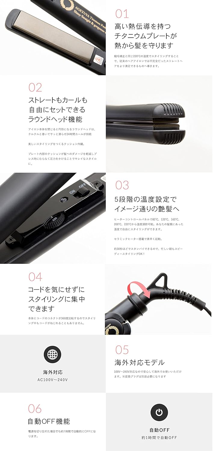 電源:AC100V~240V 消費電力:45~150W 温度調節:約80~220℃(5段階温度調節)本体サイズ:約L260×H80×W30mm コードの長さ:約2.6m バレルサイズ:32mm本体重量:約344g(コード込)プレート素材:セラミックにチタニウム加工処理生産国:Made In PRC