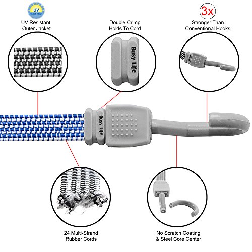 DO NOT BUY OTHER BUNGEE CORDS BEFORE READING THIS!!! Other bungee straps are not made of PREMIUM QUALITY MATERIALS like the Busy Life flat bungee assortment. Check out our STEEL CORE HOOKS, coated with plastic to prevent scratches. And our woven outer cord jacket that will resist UV RAYS and UNRAVELING.