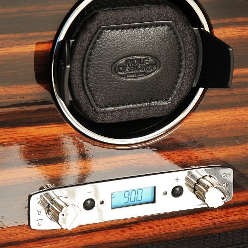 - Feature : Backlit LCD display screen powers on when control knobs or chrome plate is touched; will stay illuminated for 10 seconds / Rotation options: incrementally from 300-1200 turns per day. The LCD screen provides a countdown of remaining rotations in daily cycle. / Watch cuff has been designed to accommodate larger, heavier watches and will "lock" into the winder drum for a secure fit / Turns clockwise, counter-clockwise, or bi-directionally with the option to run the unit on 33V adapter (included) or D-Cell batteries / Features an Ebony Macassar wood veneer faceplate