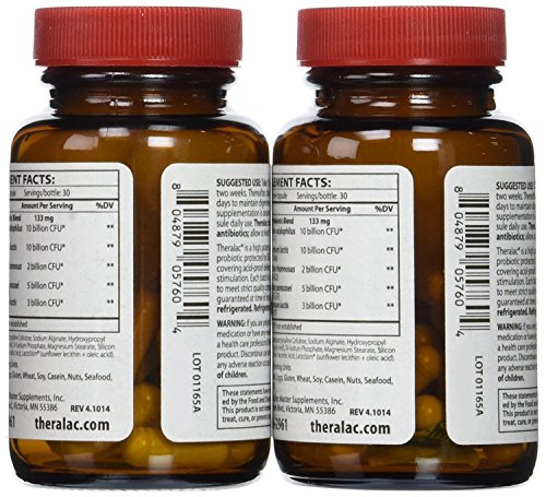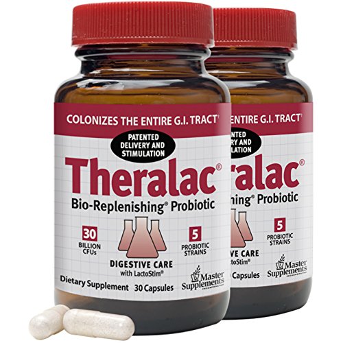 2 bottles of 30-count (total 60-count) Theralac probiotic dietary supplement contains 30 billion CFU of lactobacilli and bifidobacteria probiotic cultures for complete intestinal coverage. The strains synergize and work together to promote digestive health, wellness, and a return to regularity so you can feel your best. Probiotics promote digestive health for men and women.