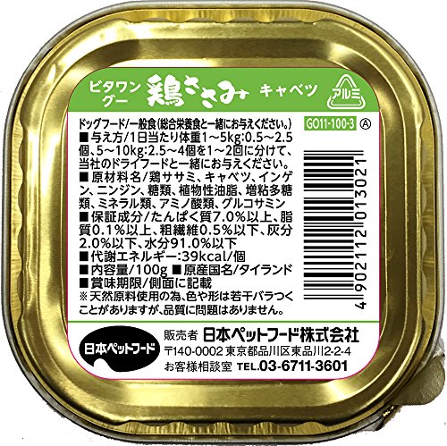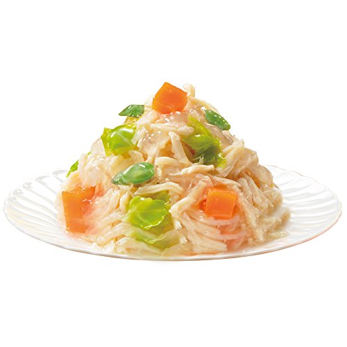 原材料:鶏ササミ、キャベツ、ニンジン、インゲン、トマトペースト、ハチミツ、増粘多糖類、塩化K、ポリリン酸Na、酸化防止剤(EDTA-Na)、グルコサミン、発色剤(亜硝酸Na)