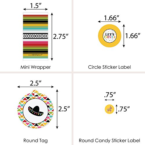 - VARIETY OF STYLES & SIZES! Let's Fiesta Favor Kit includes stickers and tags to help you create numerous party favors. Mini Candy Bars (20 wrappers, 1 3/8 inches wide x 2 5/8 inches high, fits Hershey® miniature candy bars); Circle Sticker Labels (24 stickers, 1 2/3 inches diameter) 20 Round Tags (2 ½ inches diameter, die cut & ready to use), and Round Candy Labels (108 small round stickers, .75 inches diameter, fits Hershey® Kisses® or other small, round candy).