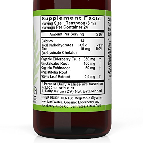 -. Feature : DELICIOUS Elderberry & Blackberry flavored essential trace element to maintain your health and help your body perform important functions daily. Great immune support for the 'cold-and-flu season', powerful antioxidant.* / MADE IN USA- FDA registered organic certified facility. It's also a GMP and Kosher certified facility. Under strict quality standards and procedures. All herbs are organically grown, ethically wild harvested, or selectively imported. No genetically modified organisms (GMOs). / INGREDIENTS: Zinc 15mg (as Clycinate Chelate), Organic Elderberry Fruit 350mg, Umckaloabo Root 100mg, Organic Echinacea 50mg, Anguvstifolia Root, Stevia Leaf Extract 0.5mg. Other Ingredients: Vegetable Glycerin, Deionized Water, Organic Elderberry & Blackberry Juice Concentrates, Citric Acid. / 100% SATISFACTION GUARANTEE - We are confident that you are going to love our Liquid Zinc Supplement, but if for any reason you are not satisfied at any time, feel free to return bottle to us and take advantage of our money back guarantee.
