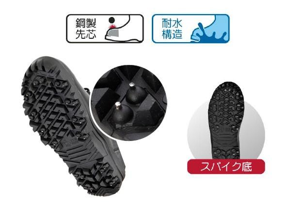 鋼製先芯と丈夫な耐水構造で足をしっかりガードするスパイクシューズです。 |