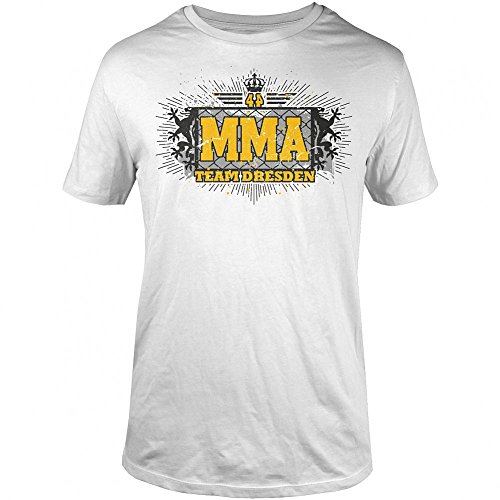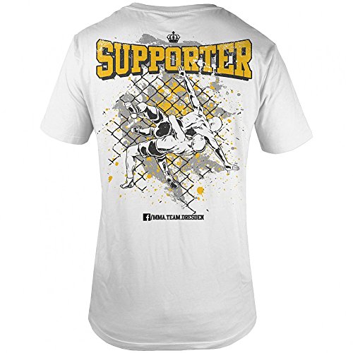-. Binding : Textilien -. Brand : MMA Team Dresden -. Color : Weiß -. Department : Herren -. Feature : hochwertiger Logo-Siebdruck auf der Vorderseite / cooler Grafik-Siebdruck mit großem ,,Supporter'-Schriftzug auf der Rückseite / gedruckt auf hochwertigem Marken-T-Shirt mit Rundhalsausschnitt / 1x1-Rippstrick mit Nackenband / schmale Doppelnähte an Ärmeln und Saum -. IsAdultProduct : 0 -. Model : 21772 -. ProductGroup : Apparel -. ProductTypeName : SHIRT -. Title : MMA Team Dresden Support T-Shirt