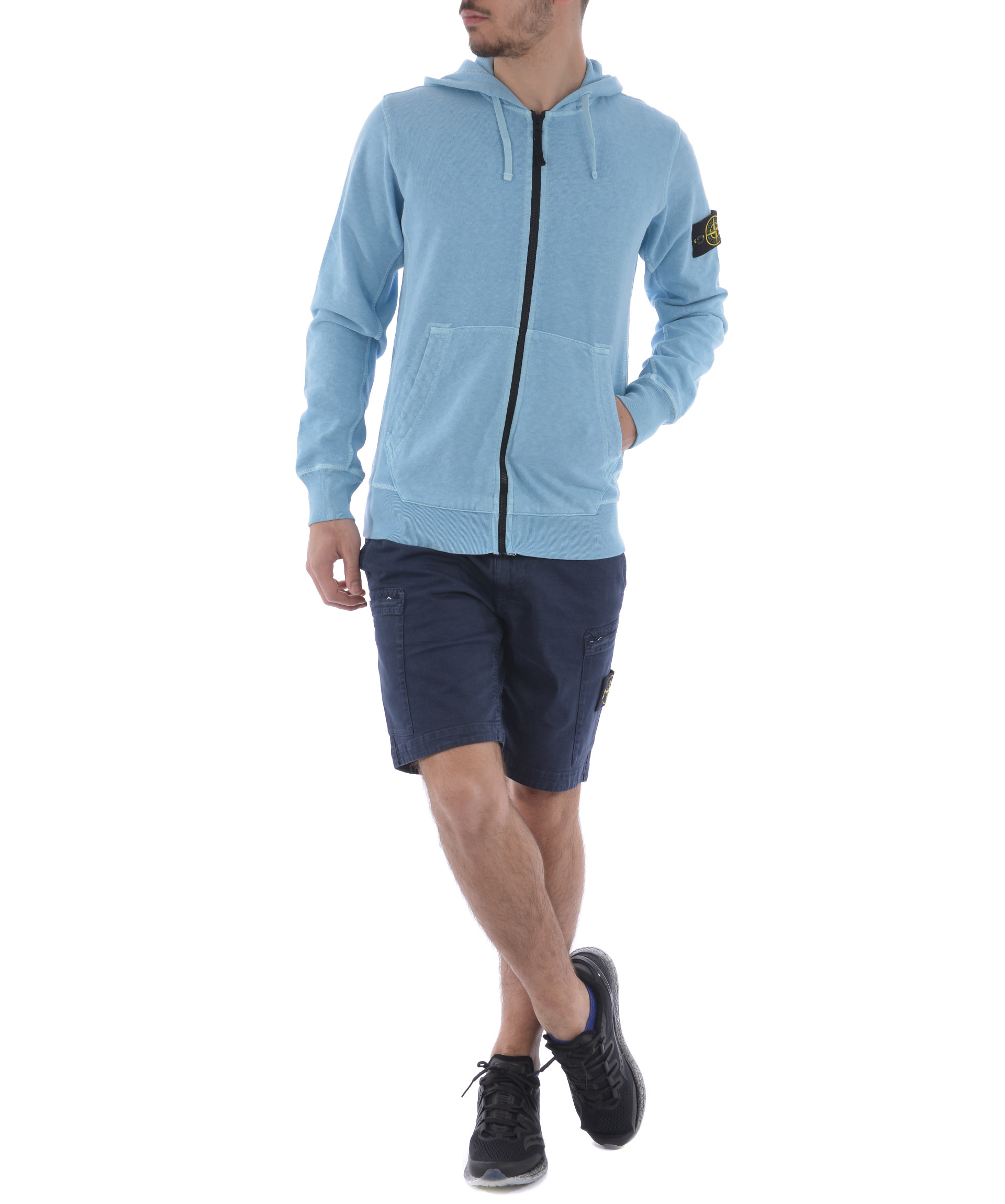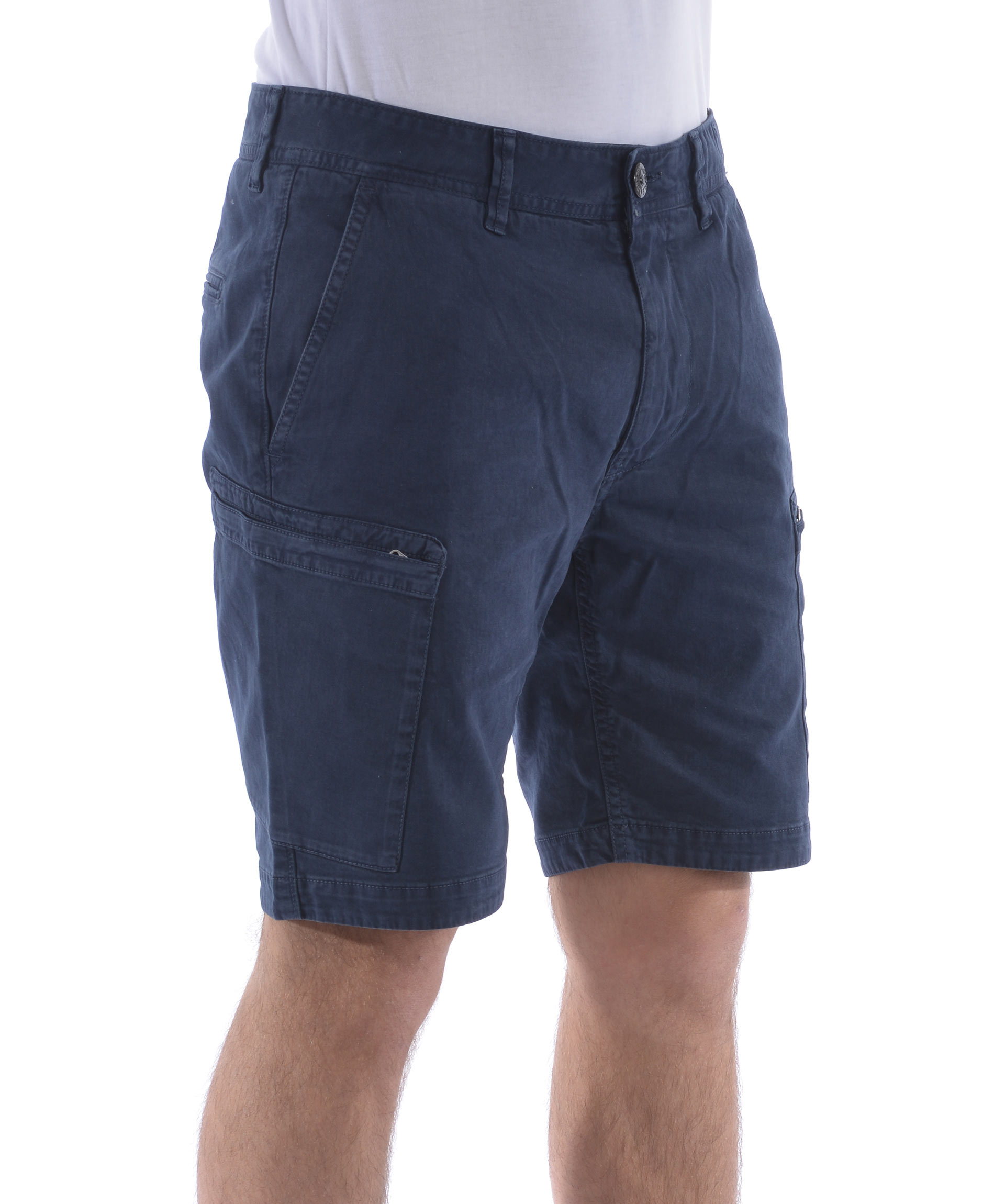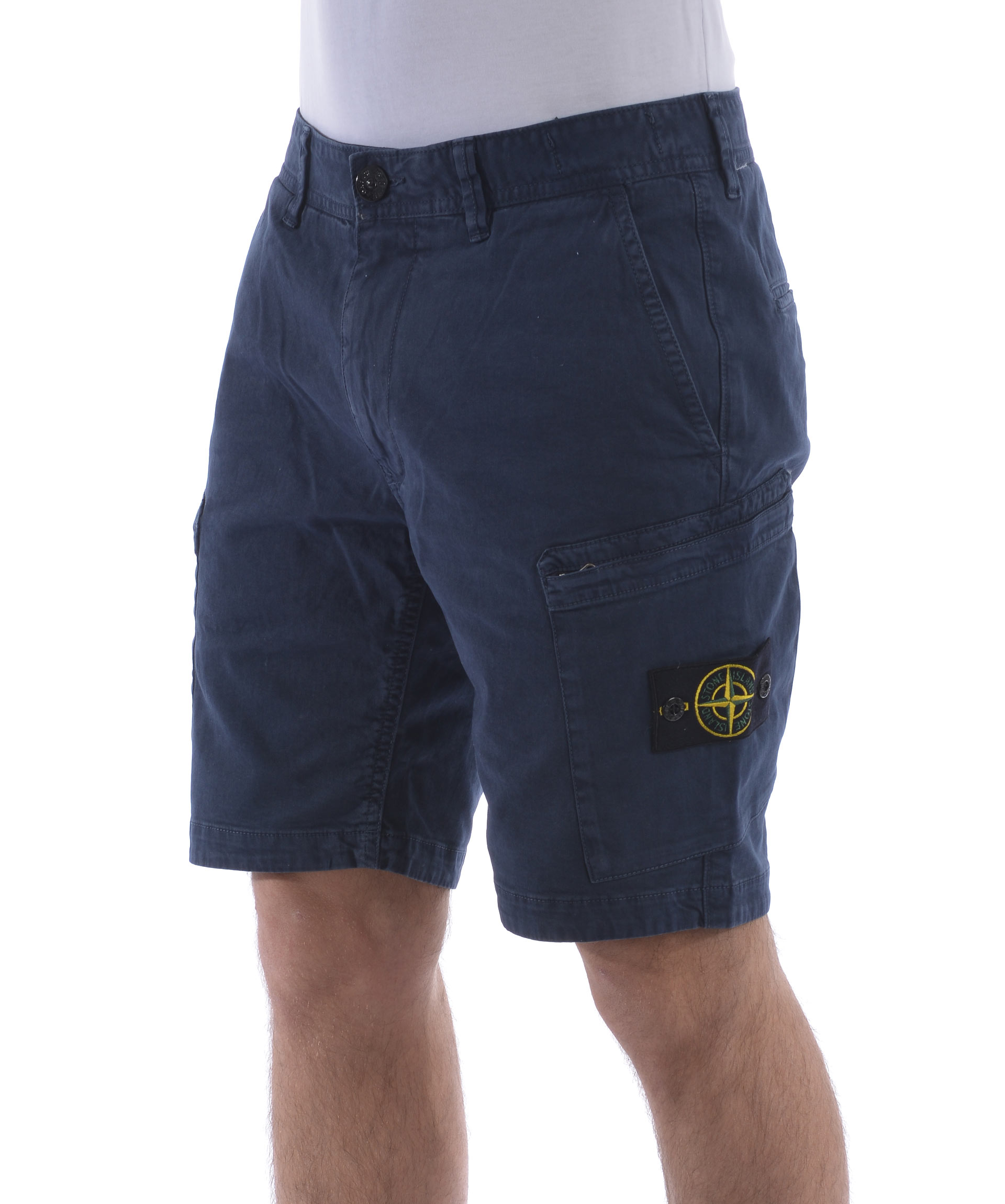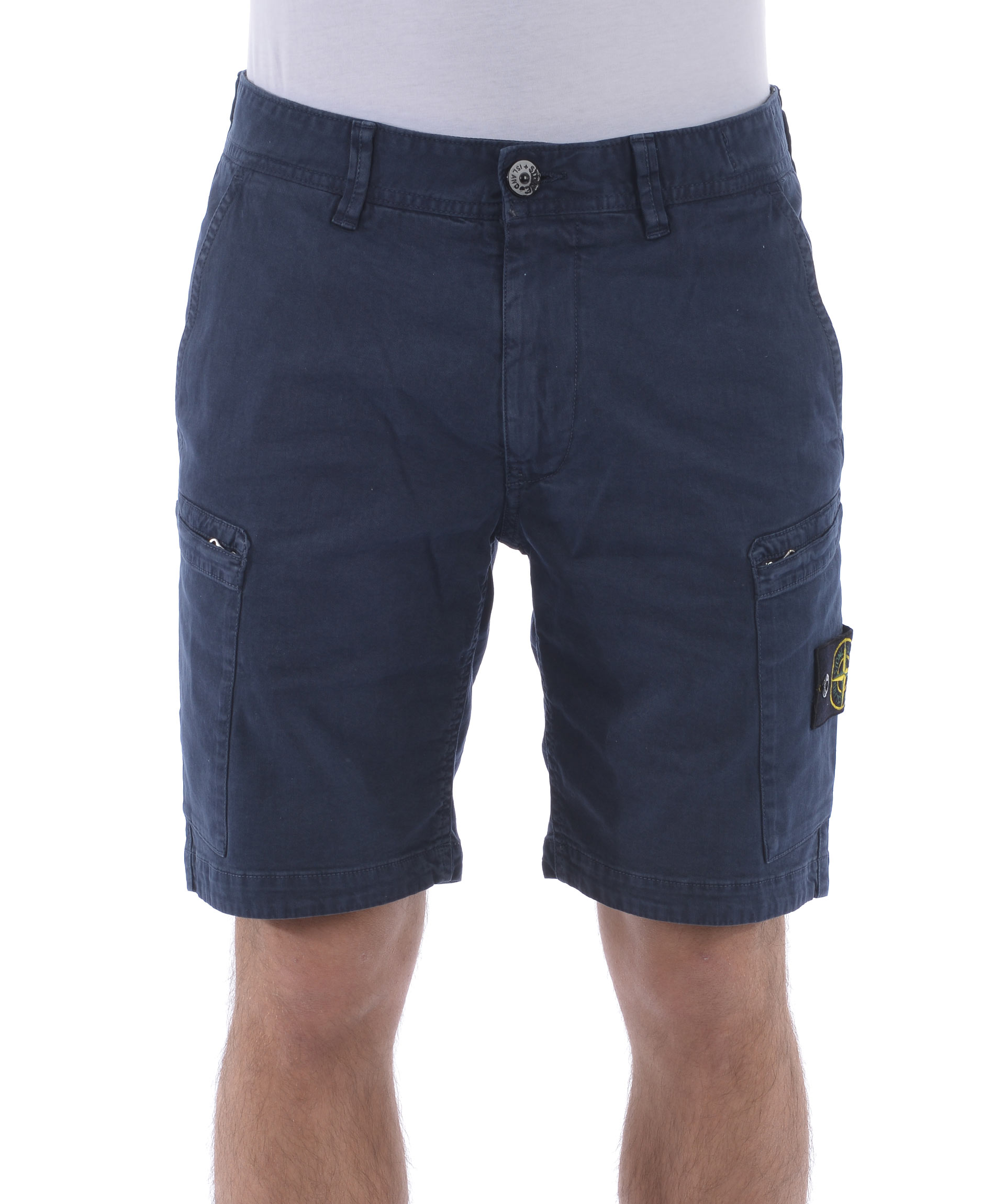 Shorts Stone Island in cotone stretch Blu effetto old. Tasche diagonali. Tasconi con zip. Tasche posteriori a filo con bottone. Chiusura con zip e bottone. Patch logo removibile sul tascone sinistro. Misura in foto 31 98% cotone, 2% elastene