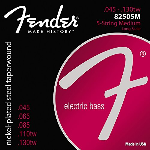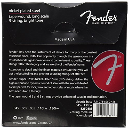 ReleaseDate : 2010-09-21 Studio : Fender Musical Instruments Corp. Publisher : Fender Musical Instruments Corp. Binding : Electronics Product Description Fender super bass 8250’s are an excellent choice forrock, funk, and any style of music in which the bassneeds to cut through.fender super bass 8250’s feature tapered winding onthe low e and b strings for superior intonation, balanceand tone. the nickel-plated construction delivers thehigh output and dynamic sound of steel with the smoothfeel of nickel. 0