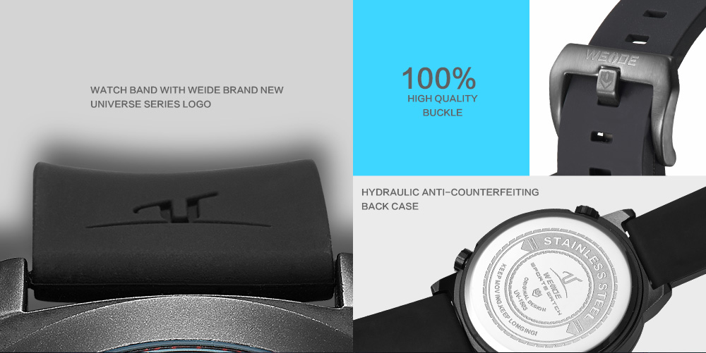 | Advanced Manufacturing Technology Jam tangan Weide UV1503 menggunakan modul digital dan analog Quartz Japan yang dapat menampilkan hari、 tanggal、 dan waktu. Strap terbuat dari bahan material silicone yang lentur、 tahan air hingga kedalaman 30 Meter.