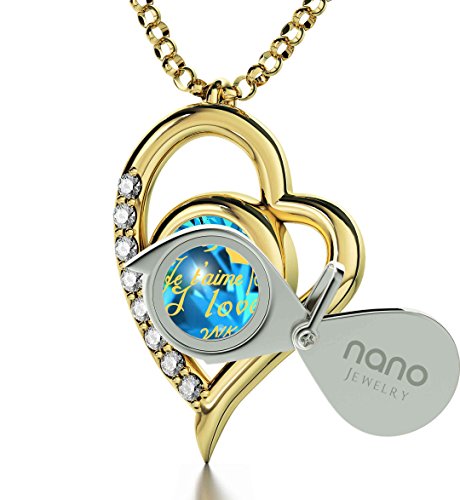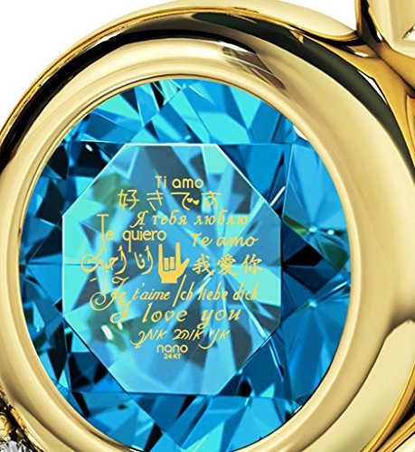 gold plated heart-shaped-shaped necklace inscribed with I love You in 12 different languages in 24k gold onto a blue crystal Swarovski gemstone, 0.3 inches, 8mm, prong set into the heart shaped frame, 1x0.65 inches, 2.5x1.65cm, embellished by 8 clear crystal cubic zirconia stones.