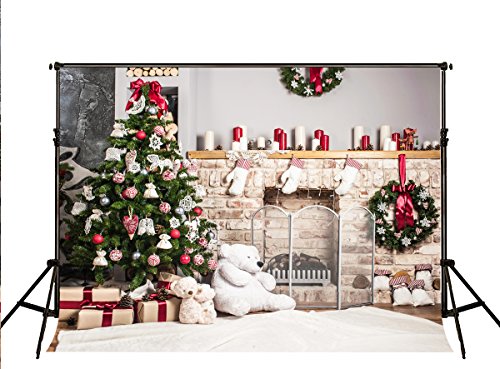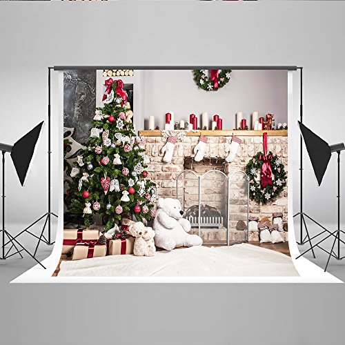 7x5ft Kate Christmas Backdrop for Photography White Brick Fireplace Bear Christmas Tree Backgrounds for Kids