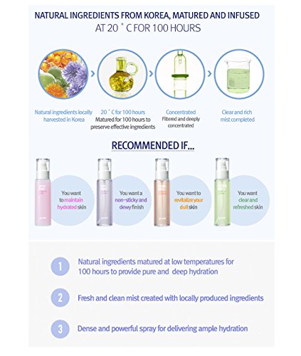Details : A moisturizing mist for hydrating parched skin / Even milder and deeper moisture by aging Korean cornflower at low temperatures for 100 hours / Country of Origin : South Korea