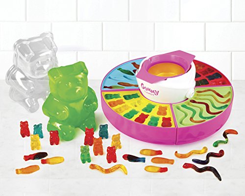 -. Feature : Make fish, bear and worm gummy candies / 4-silicone gummy candy molds and ice trays for quick-setting gummies / 1-gigantic gummy bear mold / 1-non-stick removable gelatin pot with easy-pour spout / Heated base for melting gelatin mixture / Simple on/off switch / Disassembles for easy cleaning / BPA free