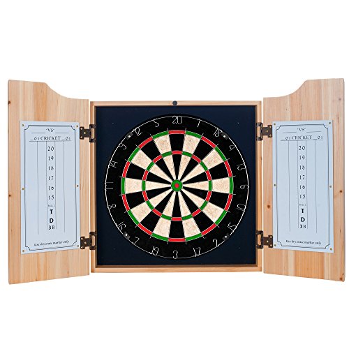 -. Feature : Self healing sisal fiber, removable number ring, official 18 inch diameter, includes 6 steel tip darts / Officially licensed art displayed on the interior and exterior of the doors / Cabinet Dimensions (closed): 3.5 x 20.5 x 24.75 inches / Solid Pine construction, dove tail joints, beveled doors, metal hinges / Interior door mounted dry erase Scoreboard and Outchart, 2 magnetic markers with erasers