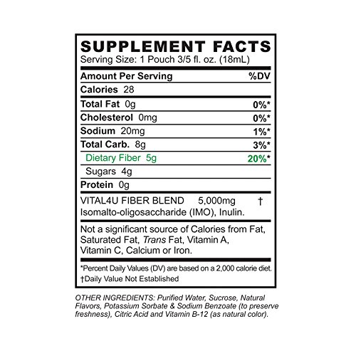 -. Feature : Each box contains 12 individual pouches, (24 Pack) is 2 x 12 count boxes / CONVENIENT: No mixing required! The first ready to drink fiber supplement of it's kind, drink straight from the pouch. Our signature pouch is compact and strong and easily travels with you anywhere! / NATURAL and EFFECTIVE: 20% of your Daily Value of Dietary Fiber! 5 grams of natural, soluble prebiotic fiber per serving. Made from Isomalto Oligosaccharide (IMO) and Inulin. / RELEIF: Prebiotic fiber helps support and feed the existing probiotic bacteria already living in your digestive tract. Prebiotics are found naturally in foods like Chicory Root, Raw Asparagus, Raw Dandelion Greens, Raw Garlic and much more. / GLUTEN FREE: Certified Gluten-Free, Only 28 calories per serving with no artificial sweeteners, colors or flavors.