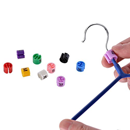 -. Feature : 50 pcs/color, 9 colors, XXS-4XL. Come with plastic storage box. 9.7mm(0.4in), Diameter: 12.5mm(0.5in), Weight: 0.6 gram/piece / Easy to Use: These are perfect for your inventory hangers. They are super easy to snap on and off if you want. / Easy to Identify: These vibrant assorted size marker can make the identification process more quickly. / Unierversal Usage:Work on standard hangers. Very strong plastic, vibrant colors. / Attention: As long as you snap them forward once in the hanger they work great, if you don't snap it then they pop off easy