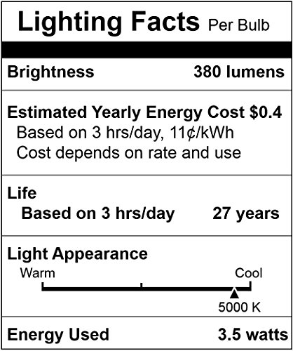 - ENERGY SAVING HIGH OUTPUT LED: 3.5W, 380 Lumens, 50W Halogen Equivalent. Voltage: 110V, 120V, 130V. 93% Energy Saving, Reduced Average Household Energy Costs to only $0.4 per Year!