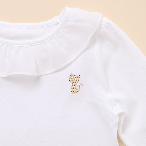 상품설명 깔끔한 화이트 컬러에 매칭 쉬폰 프릴 디자인을 더해준 기본 TS 아이템 입니다. 목 부분에 매칭 쉬폰 프릴 장식을 더해주어 더욱 시원해 보이고 하늘하늘한 느낌이 더욱 사랑스러워 보입니다. 상단에 골드 고양이 핫피스 포인트로 고급스러움를 더해 주었습니다 . 심플하고 가볍게 데일리 룩으로 코디하기 좋은 컬러감 예쁜 TS입니다.