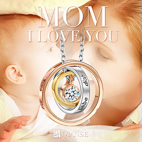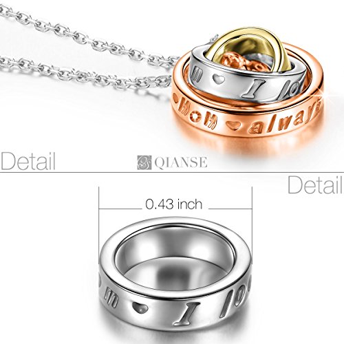 -. Feature : ♥MATERIALS & MEASUREMENTS♥ Made of 925 Sterling Silver with the highest levels of certification standards & Premium AAA Cubic Zirconia. | Chain Length: 17.32 inches +1.9 inches. Pendant Height:0.71 inches. Pendant Width: 0.71 inches. / ♥TRINITY DESIGN♥ Three rings, three symbolic colors intertwined in a display of mystery and harmony, rose gold for love, yellow for fidelity and white for friendship. Trinity, a timeless design in a collection devoted to life's most memorable loves. Best gift for mom. / ♥Perfect Gift For Mother♥ Engraved Scripts of "Mom I Love You" & "Always be with You" . This layered pendant is designed with three cascading rings that bring out a graceful stereoscopy. Cast from rose gold, silver and gold plated brass. Decorated with a clear sparkle crystal. This polished piece is a perfect choice for Moms. ♥Comes in a gift box♥ / ♠OFFICIAL CERTIFICATE CARD♠ Each product has its unique code. It is not an imitation from other sellers if you got a card and you are the first one to verify. You will also find a website from SWAROVSKI® in our Official Verify Website. Input "qianse" to check we are the authorized partner to sell products with their crystals! / ♥QIANSE Designing Philosophy♥ 1. Be brave to pursue the beautiful fairy tale in your heart because it is the P.R.Ivilege of being a woman! 2. Jewelry has no value, but the jewels which can make women shining are P.R.Iceless! 3. Wearing ordinary jewelry, people remember that jewelry. Wearing elegant jewelry, people remember the woman who wears that jewelry.