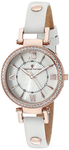 Christian Van Sant Women's Petite Stainless steel case, Leather strap, white mother of pearl dial Swiss Parts Quartz movement, Scratch resistant mineral, Water resistant up to 3 ATM - 30 meters - 99 feet