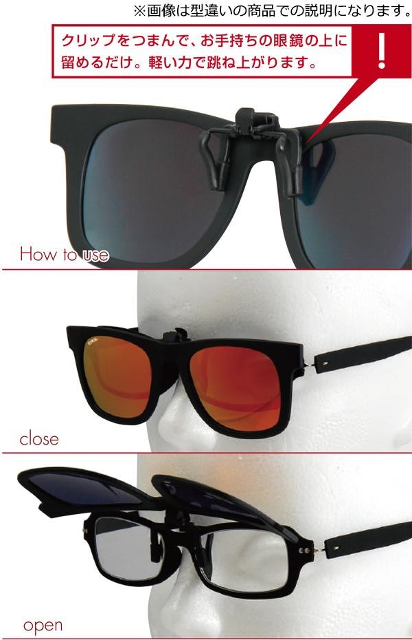 fk094igrjsクリップをつまんでお手持ちの眼鏡の上に留めるだけ軽い力で跳ね上がります サイズ 個装サイズ:5×16×6cm 重量 個装重量:60g 素材・材質 フレーム:TR90 レンズ:TAC 仕様 UVカット率:99.9% 【可視光線透過率】 1:12% 4・6:10% 5:14% 8:13% 製造国 中国 眼鏡の上から簡単装着 ※モニターの設定などにより、実際の商品と色味や素材の見え方が異なる場合がございますあらかじめご了承ください ※製品の仕様は予告なく変更になる場合がございますご了承ください クリップをつまんでお手持ちの眼鏡の上に留めるだけ軽い力で跳ね上がります