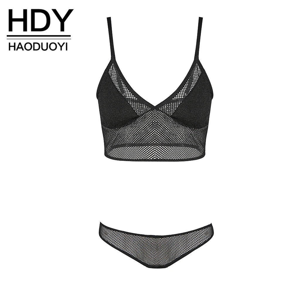 HDY Haoduoyi Solid Black Women Sexy Mesh Bra Adjustable Spaghetti Straps Lace Bralette Hollow Out Panties Soft Fitted Bra Sets |