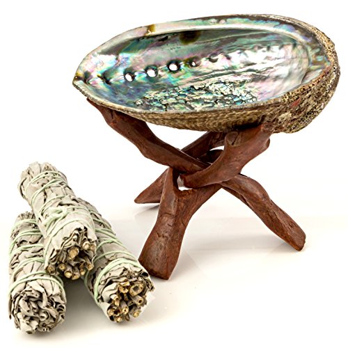 Premium Abalone Shell with Wooden Tripod Stand and 3 California White Sage Smudge Sticks for Incense Burning, Home Fragrance, Energy Clearing, Yoga, Meditation (6" Abalone Shell)