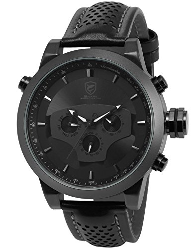 -. Title : Black Requiem Shark Series Dual Time Zone Analog Date Day Men's Leather Strap Sport Wrist Watch SH210