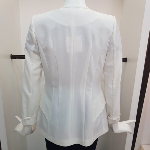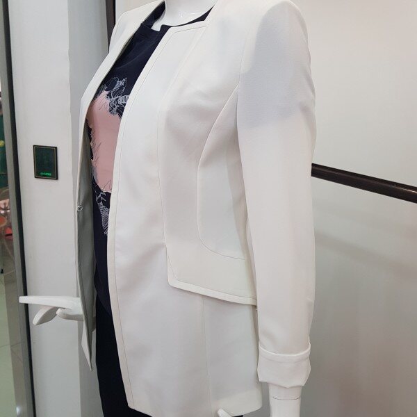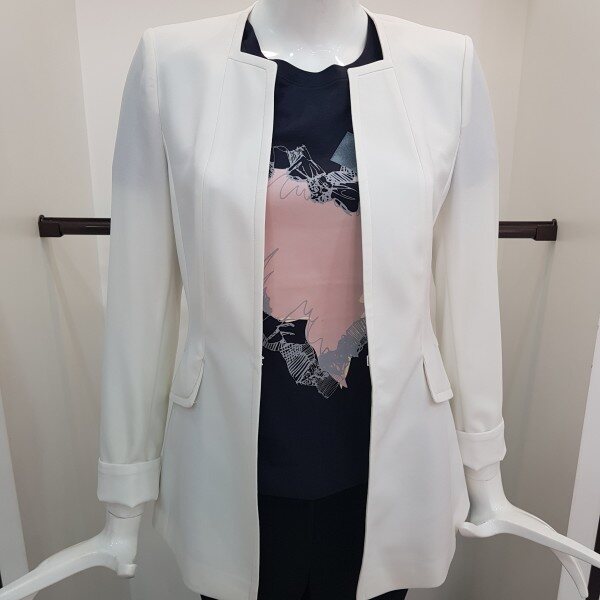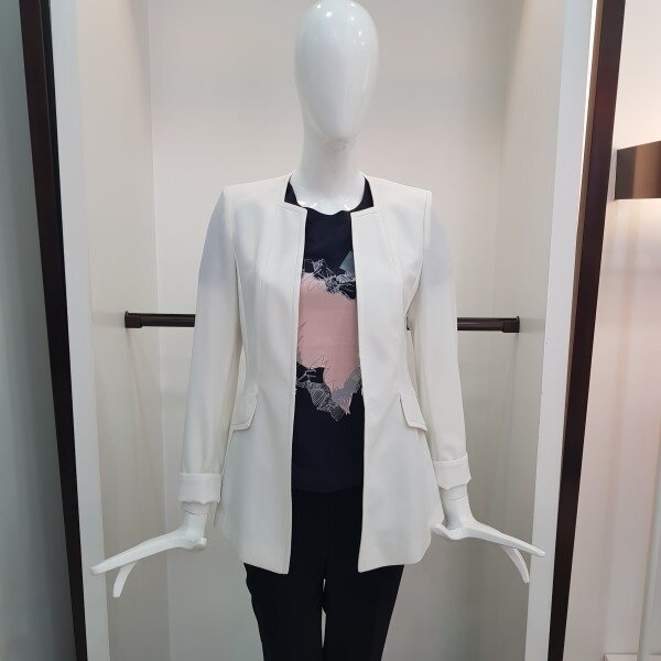 소매 배색이 있어 멋스럽고 힙덮는 기장감의 노카라자켓