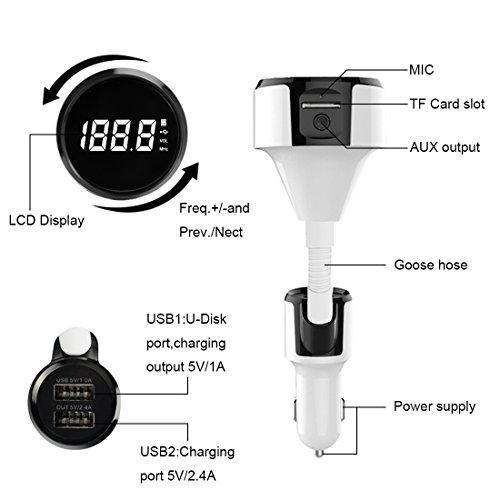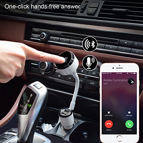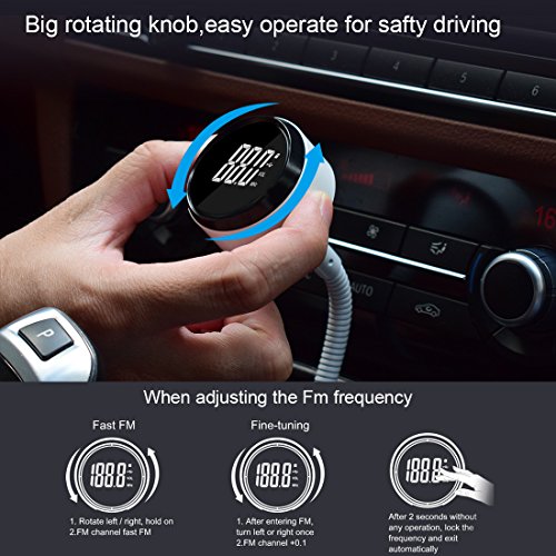 Hands-Free Answer: Multi-function button of this Bluetooth Car FM Transmitter is designed for hands-free control calls. Big rotating knob for easily adjust the FM frequency and previous or next song. Ideal for car navigation (voice broadcast via car audio), keeps car or truck driving safety.