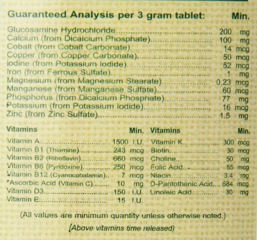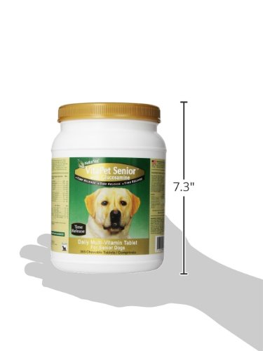 NaturVet VitaPet Senior Daily Vitamins Plus Glucosamine for Senior Dogs Provides a Full Spectrum of Daily Essential Vitamins and Minerals. Added Glucosamine Provides Extra Joint Support to Maintain Healthy Joint Function. Time Release, Chewable Tablets 365ct for Senior Dogs Six Years of Age or Older. Sick, Convalescing, Pregnant or Nursing Dogs Recommended to Double the Suggested Daily Amount. Guaranteed Analysis per 2.6 Gram Tablet: Calcium, Phosphorus, Potassium, Magnesium, Iron, Copper, Manganese, Zinc, lodine, Vitamin A, Vitamin D3, DL-alpha-tocopheryl acetate (Vitamin E), Thiamine (Vitamin B1), Riboflavin (Vitamin B2), Pantothenic Acid, Niacin, Pyridoxine (Vitamin B6), Folic Acid, Vitamin B12, Choline, Glucosamine, Ascorbic Acid (Vitamin C), Menadione (Vitamin K), Biotin and Cobalt. All NaturVet Products are Veterinarian Formulated and Manufactured in the USA in an FDA Audited, cGMP Compliant Facility with a 100% Satisfaction Guarantee.Feature