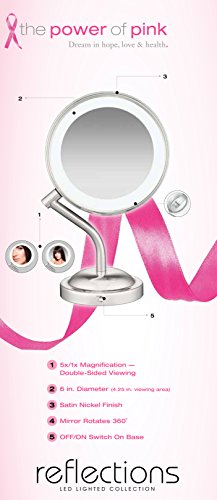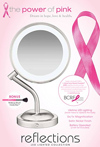 -. Title : Conair Round Shaped LED Double-Sided Battery Operated Lighted Makeup Mirror; 1x / 5x Magnification; Satin Nickel Finish; Bonus Makeup Brush Included