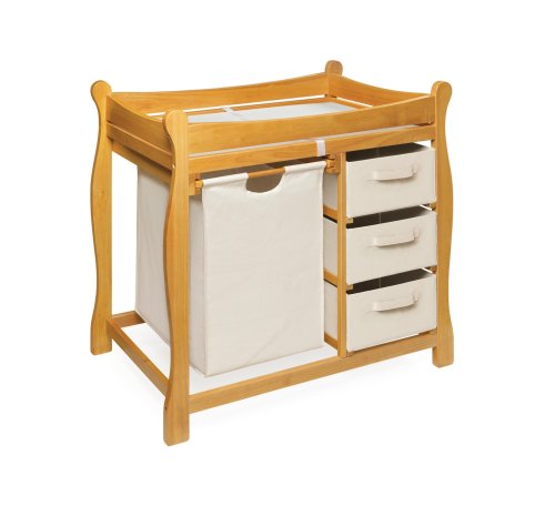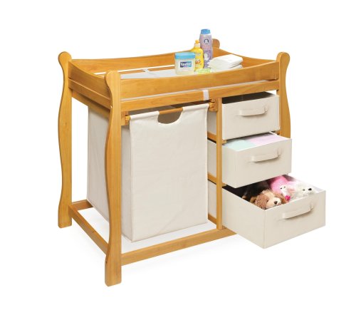 Product description Say goodbye to the look of a cluttered changing table! The Badger Basket Sleigh Changing Table with Hamper and Drawers keeps everything perfectly organized and tucked neatly out of sight. Use the large pull-out hamper for baby's dirty duds, or for storing bulk items. The convenient drawers keep diapers, wipes, clothing, and other changing necessities within easy reach.?This changing table is as attractive as it is functional. The convenient changing table includes a vinyl covered foam changing pad and safety strap. The table top is surrounded by a softly edged rail and supported by a metal bar beneath the changing surface for extra security and stability. Wipes clean with mild soap and damp cloth. Hamper bag can be removed for washing. Illustrated step-by-step guide makes assembly a snap. Dimensions 37.5L x 19W x 37.5H inches.Badger Basket Company For over 65 years, Badger Basket Company has been a premier manufacturer of baskets, bassinets, bassinet bedding, changing tables, doll furniture, hampers, toy boxes, and more for infants, babies, and children. Badger Basket Company creates beautiful and comfortable products that are continually updated and refreshed, bringing you exciting new styles and fashions that complement the nostalgic and traditional products in the Badger Basket line. Dimensions 37.5L x 19W x 37.5H inches. Lovely Sleigh Changing Table with unlimited storage options. Makes organizing your changing supplies a breeze. Softly sculpted legs gives an elegant look. Includes hamper, three baskets, changing pad with safety straps. Constructed of wood and wood composite, hardboard top shelf. Safety rails and metal support bar provide extra security. Available in a variety of finishes. Assembly required. 0 |