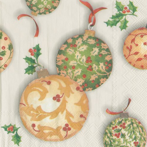 Ideal Home Range Cocktail Decorative Paper Napkins, Holly Ornaments on Cream, 20 Count