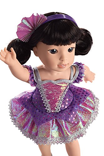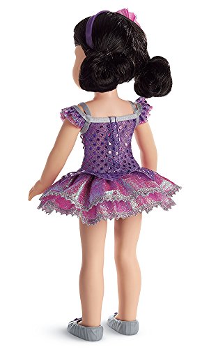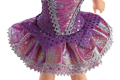 Emerson adores performing in this shimmery ballet recital dress. It has an iridescent double-layered skirt, and gathered off-shoulder sleeves with shiny straps and trim. The outfit comes with a matching headband with a pleated iridescent headpiece, plus a pair of ballet shoes with purple bows.