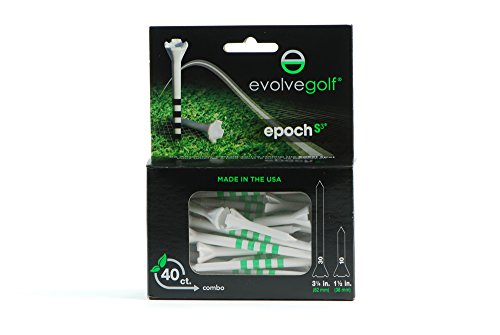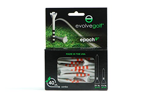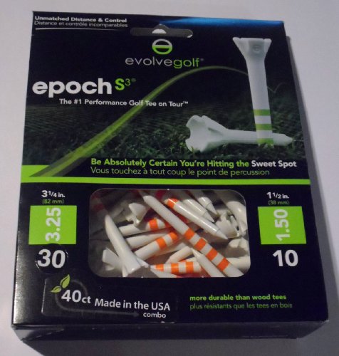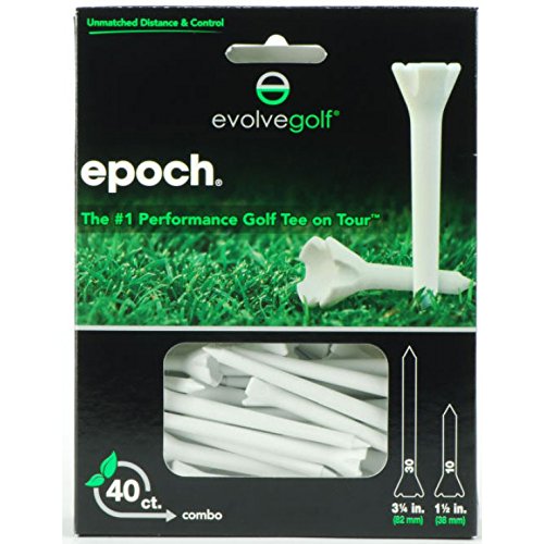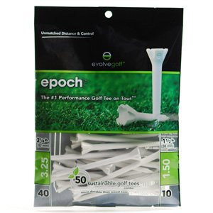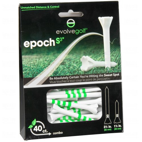 Studio : Epoch-S3 Publisher : Epoch-S3 Binding : Sports Product Description Evolve Golf 3 1/4" and 1 1/2" Epoch 50 ct Combo Pack Golf Tees The Evolve Golf Epoch Golf Tees are the No.1 performance golf tee on the Tour. Epoch performance golf tees have accumulated 127 wins on the major Tours, including 48 PGA Tour victories. Don't Mess With The Dimple! The Epoch is the only performance tee with radius posts that span the width of a golf ball dimple. This unique feature creates the lowest coefficient of friction of any tee, eliminating deflection at impact and increasing ball speed and control off the tee. 0