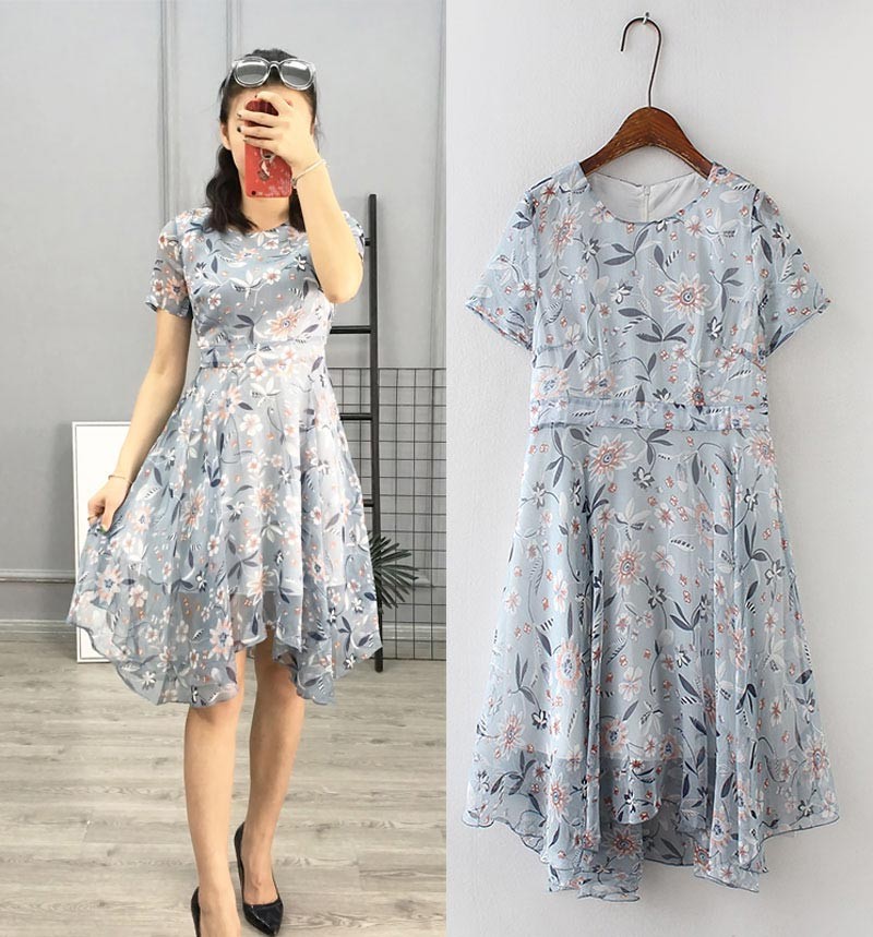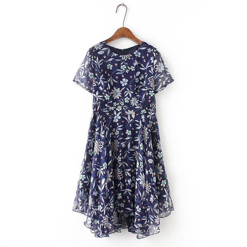 裾がギザギザラインのラウンドネック・半袖ボタニカルプリントワンピースです♪