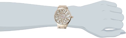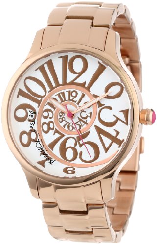 Step out with a ton of intrigue wearing this hypnotic timepiece from Betsey Johnson®! Polished rose gold-tone stainless steel case and bracelet. Fold-over clasp closure with push-button release. Three-hand analog display with quartz movement. White optical dial features rose gold-tone numerals in a swirl design and fuchsia second hand. Water resistant 3 ATM/30 meters. Imported.Feature