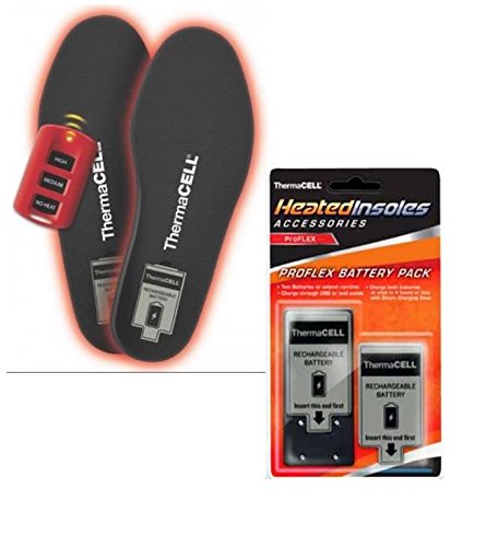 -. Binding : Sports -. Brand : Thermacell -. EAN : 0025675010680 -. Feature : •Enjoy your favorite outdoor activities without worrying about cold feet / •Rechargeable foot warming insoles are operated by a wireless remote control while the insoles remain inside your shoes or boots / •Battery-powered electric heated insoles are perfect for hunters, hikers, skiers and other outdoor enthusiasts / • You get a total of 4 batteries -. Label : ThermaCELL -. Manufacturer : ThermaCELL -. ProductGroup : Sports -. ProductTypeName : OUTDOOR_RECREATION_PRODUCT -. Publisher : ThermaCELL -. Studio : ThermaCELL -. Title : ThermaCELL Heated Insoles ProFLEX Large With Extra Battery Pack -. UPC : 025675010680