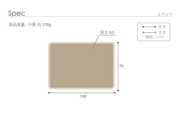 サイズ(cm):70x100、厚さ約0.5cm、中綿量約170g