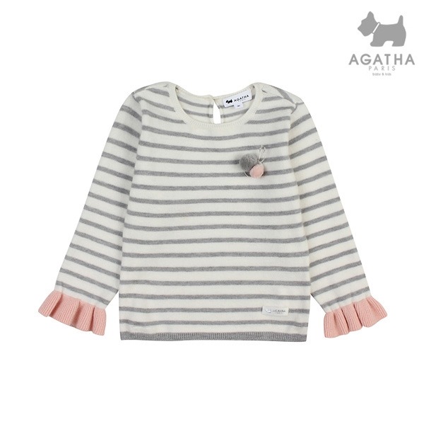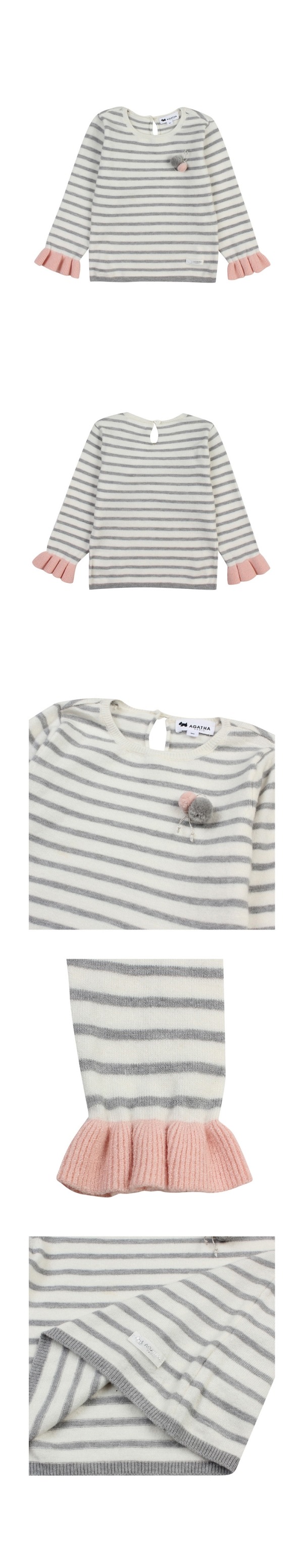 쇼바리단 소매가 포인트인 스트라이프 여아 스웨터로 가슴에 폼폼장식을 하여 여아스러움과 귀여움을 준 스타일입니다.부드러운 느낌의 니트 소재가 착용하기 좋은 제품입니다.