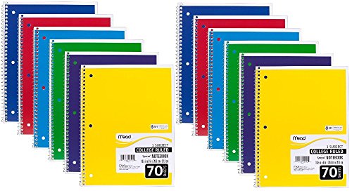 It's back to basics with this Mead spiral notebook that you can take with you in or out of a binder. 1 subject, 70 sheets, college ruled. Covers come in an assortment of colors, color received may vary.