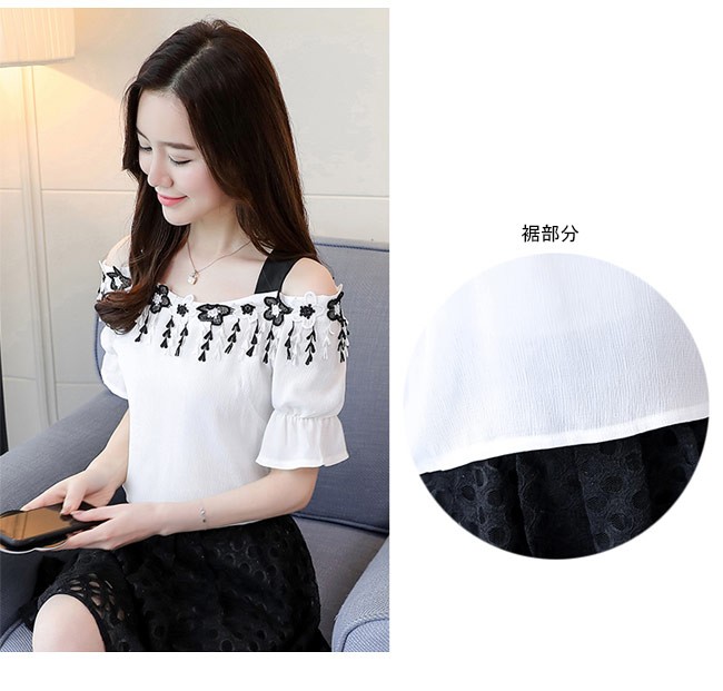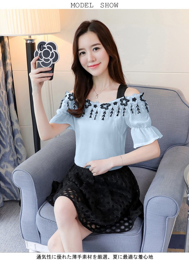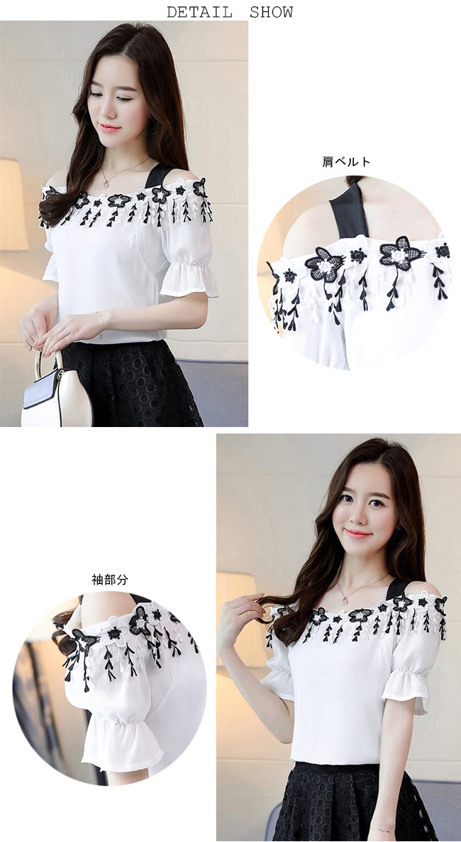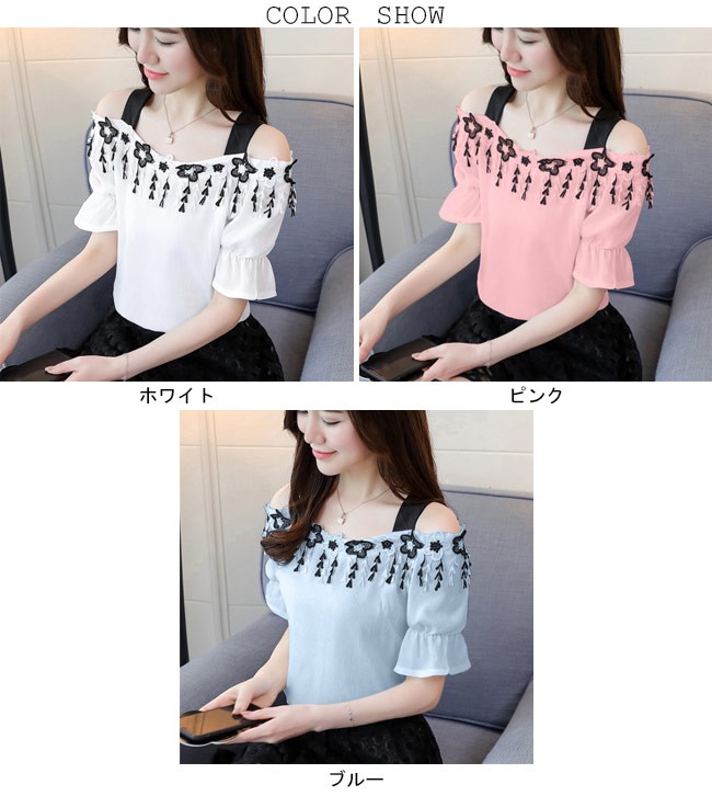 半袖ブラウス オフショルダー レディース シフォンブラウス 肩出し トップス ゆったり 夏物 女性用 Tシャツ 薄手 キュート セクシーレディース用の半袖ブラウスが登場通気性に優れた薄手素材を厳選、夏に最適な着心地立体的なカッティングにゆったりし過ぎずタイト過ぎずのサイズ感は美しいボディーラインを引き立てるオフショルダーのデザインで若い女性ならではの色気を醸し出す胸元に一回りの花柄レースの飾りと袖口のフリルは甘さと華やかさを加える太めの黒い肩ベルトで美しい首元のラインを強調、とても気質アップパンツコーデにもスカートコーデにも似合い、ボトムス選ばずに着れる一枚カラー:ホワイト ピンク ブルー素材 ポリエステルサイズ(cm) S M L XL 2XLS バスト91 着丈56M バスト95 着丈57L バスト99 着丈58XL バスト103 着丈592XL バスト107 着丈60ご注意:※サイズは平置きサイズです。素人採寸ですので、若干の誤差がございます、ご了承ください。